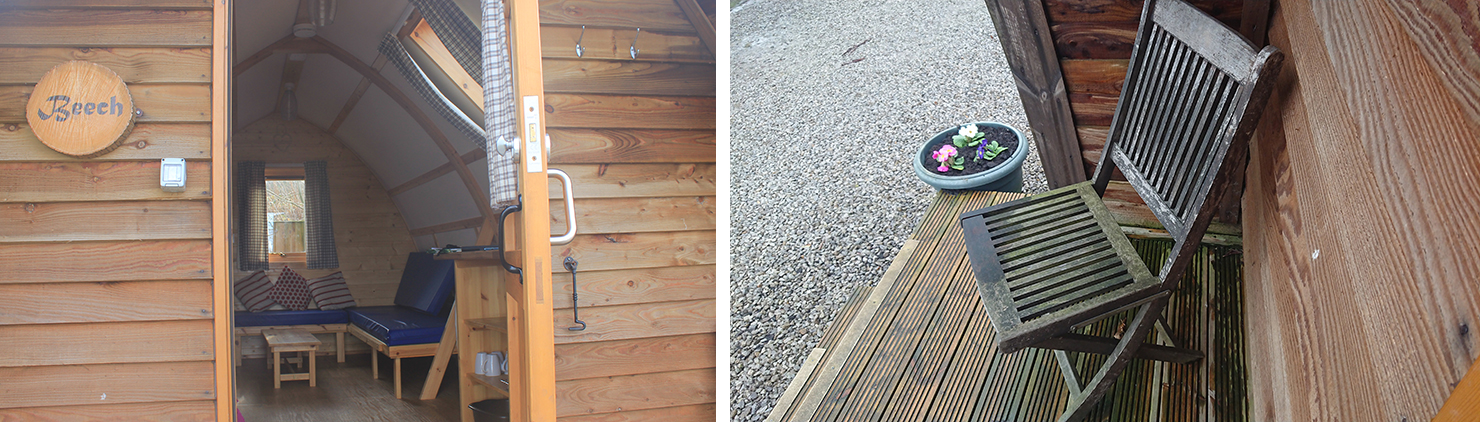 The toilet and shower block on the left and the little green washing up cabin beyond